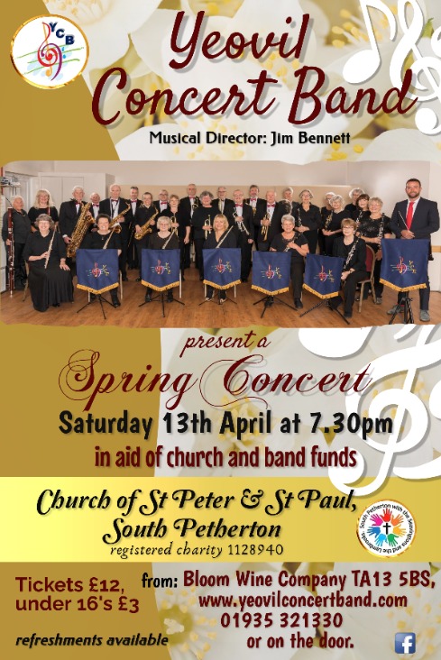 Concert in aid of church and band funds. Bring your family and friends and enjoy a great evening of musical entertainment including selections from Morricone, Queen, Disney film music, popular classics, 80's hits, marches and much more. Doors open 7pm, concert starts 7.30pm. Tickets £12, under 16's £3, available from Bloom Wine Company (TA13 5BS), www.yeovilconcertband.com, 01935 321330 or on the door. Refreshments are available to purchase before and during the concert.