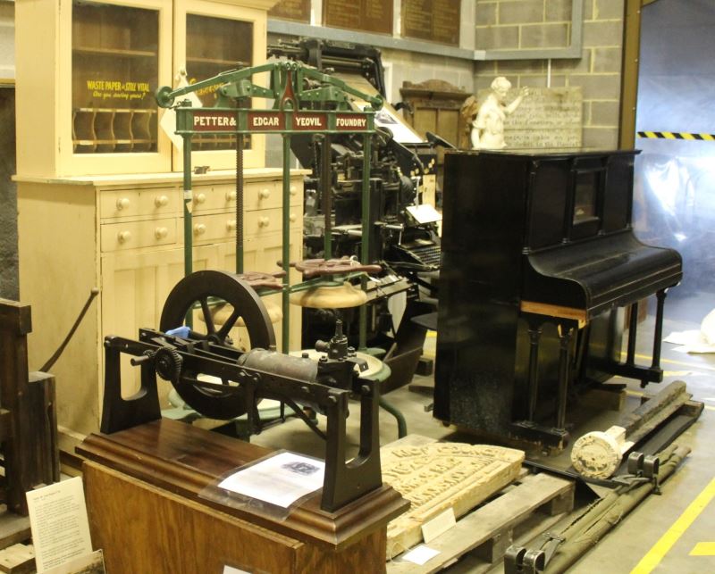 The Petter / Westland story is well represented by a Petter and Edgar Cheese Press, shown below, the engine of the 1895 Horseless Carriage, an example of the Nautilus Grate and a Petometer adding machine, an early form of calculator. We also have a Linotype typesetting machine last used by the Western Gazette Newspaper in 1984 shown alongside the cheese press and examples of objects and photographs related to St. Ivel, makers of lactic cheese up until 2000.