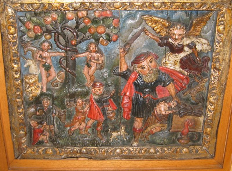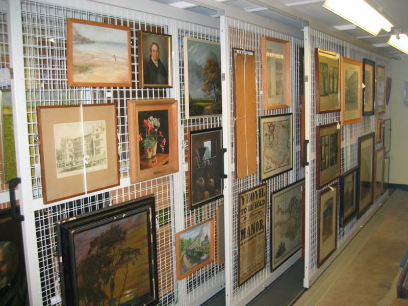 We care for around 50 paintings and artworks, plus maps, posters and local advertising. These range from formal portraits of gloving factory owners and their wives to more contemporary works by Martock-based artist, Arlie Panting and ‘pop artist’ Stephen Wilmot ‘Wilf.’ One of the star items is the Angel Inn Panel from 1603, shown below which came from the Angel Inn in Yeovil, now the site of the NatWest Bank. Alongside is a painting of a steam locomotive at Stoford pulling a two-coach train from Yeovil Junction to Pen Mill Station, otherwise known as a ‘push and pull’ Painted by H. Ball in 1971.